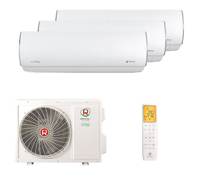 Еще одна новинка этого сезона мульти-сплит система Royal Clima RCI-PFF09HN x 3 / 3TFM-25HN/OUT. Изысканный дизайн блока, плавные формы, пульт с большим экраном и практически бесшумная работа внутреннего блока позволяет насладиться комфортом сразу во всем доме.