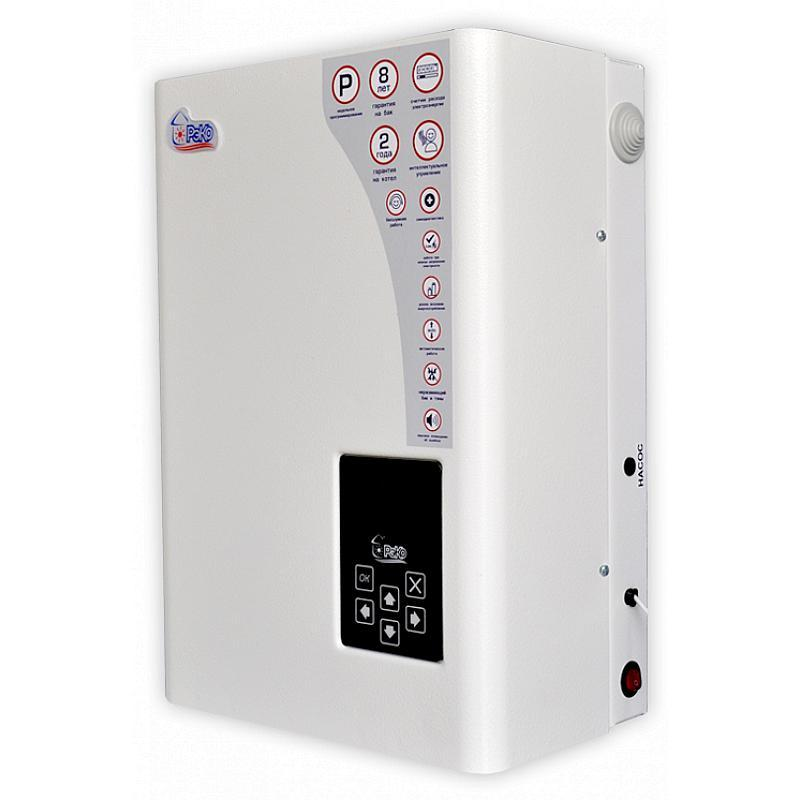 Одноконтурный электрокотел РЭКО 30П . ТЭНы заключены в теплообменник с патрубками входа и выхода. На теплообменнике имеется выключатель перегрева, а так же датчик, замеряющий температуру теплоносителя на выходе. Компоненты управления и коммутации питаются напряжением через выключатель. Электрокотел полностью экологичен для окружающей среды.