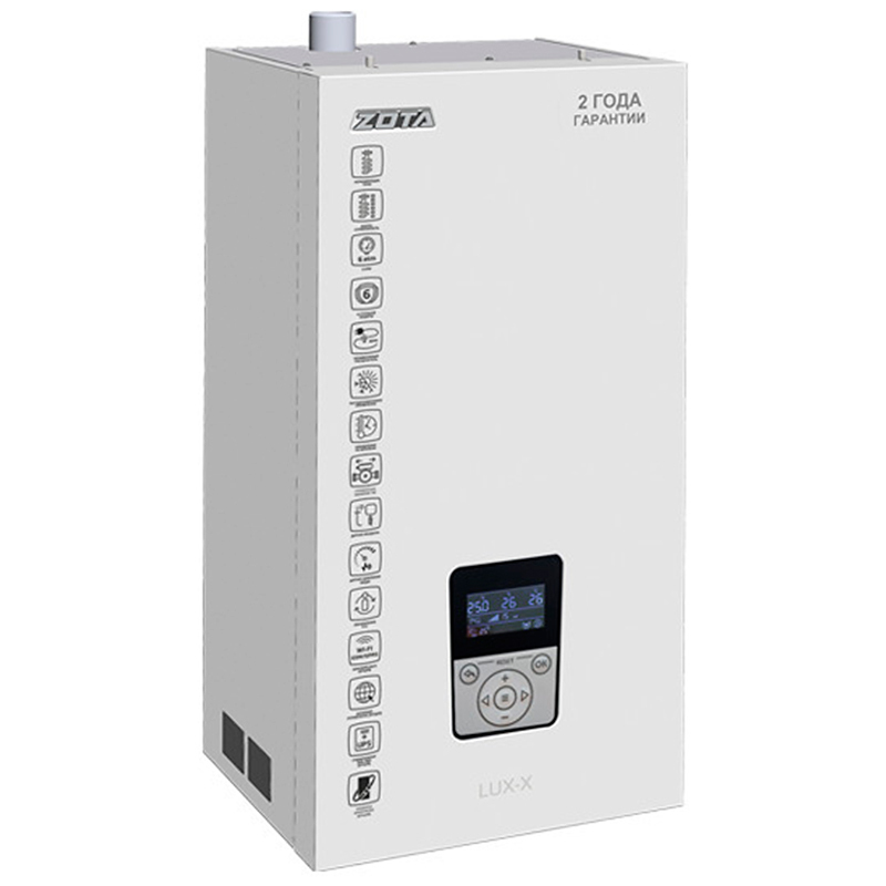 Серия электрокотлов LUX-X от российского бренда Zota представлена изделиями, которые предназначены для обогрева помещений любого типа (жилых, производственных, офисных). Все модели оснащены электронным контроллером X-Line 100E, который значительно упрощает процесс настройки, управления и регулировки отопительной системы.