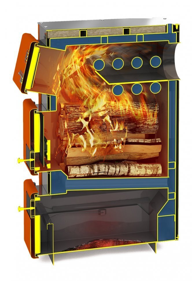 - 12 часов горения. Время горения на одной закладке угля - до 12 часов. Такая длительность достигнута благодаря системе подачи вторичного воздуха в камеру сгорания и водотрубной колосниковой решетке, которая снимает тепло даже с тлеющих углей.